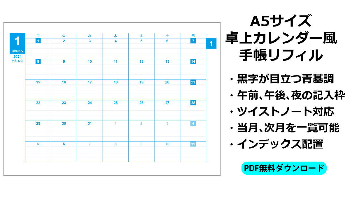 DIY手帳リフィル 卓上タイプの月間カレンダー 2024年版 更新日:2024年12月29日 公開日:2023年11月30日 A5 ツイストノート 自作手帳A5 ツイストノート 自作手帳リフィル 自作手帳ライフをもっと便利にするために、卓上タイプのカレンダーを作りました。 このリフィルは、A5横レイアウトに1か月分のカレンダーを見やすくデザインしてあります。そして、上下に穴をあけることで2か月分のカレンダーを一覧 […] 続きを読む
