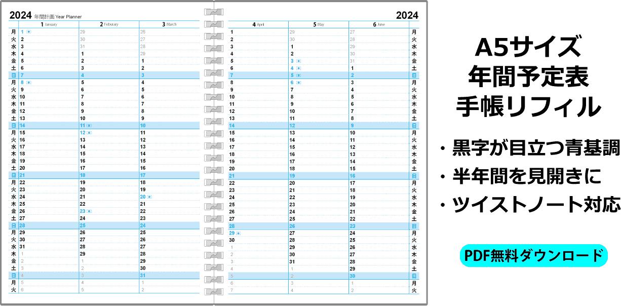DIY手帳リフィル A5サイズ年間スケジュール(半年見開き) 更新日:2024年12月29日 公開日:2023年11月29日 A5 ツイストノート 自作手帳A5 ツイストノート 自作手帳リフィル 自作手帳ライフをもっと便利にするために、2024年から2026年まで年間カレンダーを公開します。このカレンダーは半年分を見開きで一覧できるようにデザインしました。 半年間分の予定や目標を一目で確認できます。手帳にこのリフ […] 続きを読む